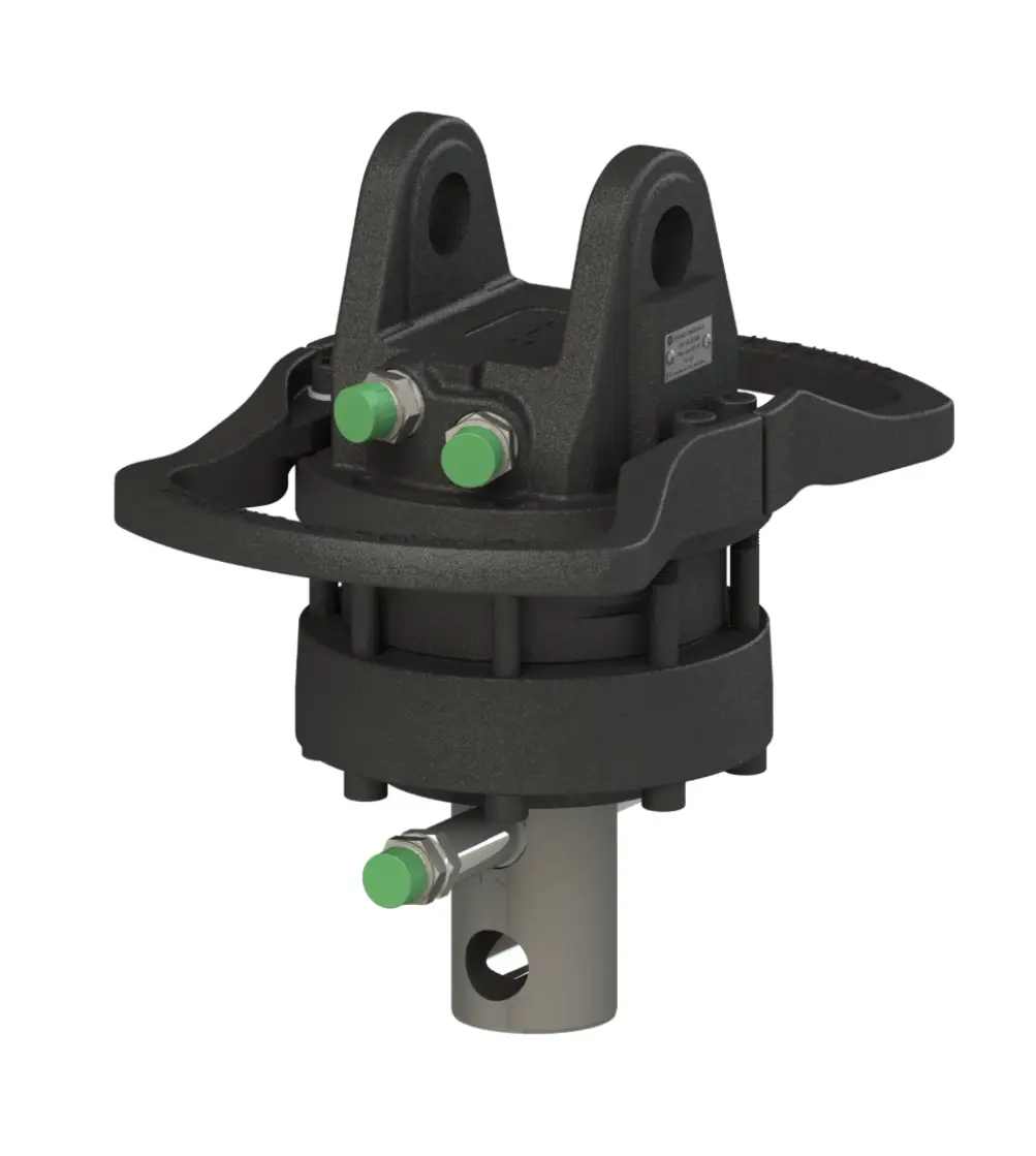 Il cuore tecnologico di questo modello è il motore idraulico a palette, che assicura una rotazione continua a 360° fluida e potente. Con una coppia di 1850 Nm, il rotatore è in grado di posizionare carichi pesanti con estrema precisione, anche quando lavora alla pressione massima di 250 bar. La struttura interna a doppio cuscinetto è un elemento distintivo: questa configurazione permette di gestire sia carichi in trazione (quando si solleva un tronco o un rottame) che carichi di spinta (quando si preme l’attrezzatura contro il terreno), garantendo una vita utile molto superiore rispetto ai rotatori standard.
