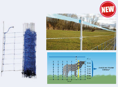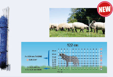 Rete difesa Cinghiali lunghezza 50mt: 3 file di TriCOND bianco/blu rispettivamente con 3 x 0,30 mm di fili metallici TriCOND offrono una conduttività ottimale (fino a 10.000 m di lunghezza della recinzione) 12 paletti in vetroresina blu con una distanza tra i paletti di circa 4,5 m inclusi